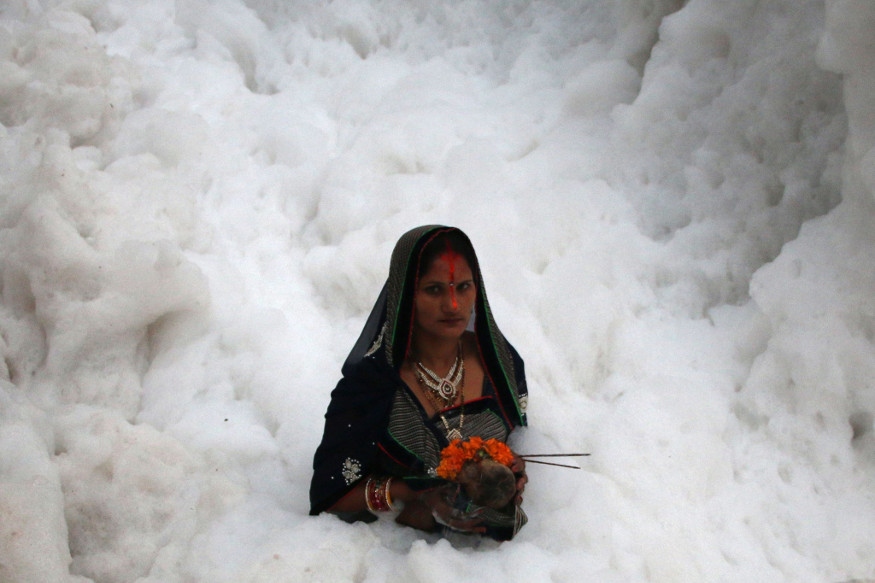 दिल्ली (Delhi) के कालंदीकुंज (Kalandikunj) में बने यमुना घाट (Yamuna Ghat) पर कैमिकल के चलते फेन की चादर बिछी हुई है. इस खतरनाक कैमिकल के बीच खड़े होकर महिलाओं ने अपनी पूजा की.